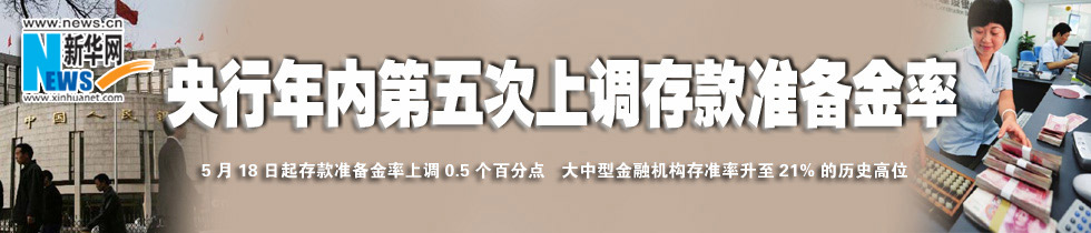 央行12日晚間宣布,從5月18日起,上調(diào)存款準(zhǔn)備金率0.5個(gè)百分點(diǎn)。這是央行年內(nèi)第五次上調(diào)存款準(zhǔn)備金率,也是去年以來(lái)第十一次上調(diào)。本次上調(diào)大約可鎖定商業(yè)銀行3700億元資金。 [詳細(xì)]