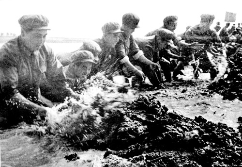 ????西昌衛(wèi)星發(fā)射中心西昌發(fā)射場(chǎng)建設(shè)初期,老一輩航天人在安寧河中搶建長(zhǎng)征橋(資料圖片)。新華社發(fā)