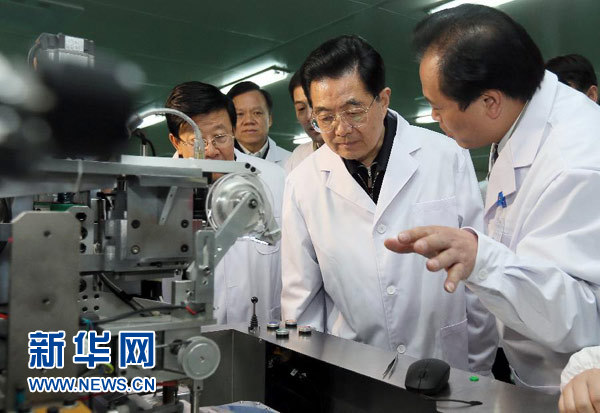 ????12月1日至6日,國家主席胡錦濤在貴州考察工作。這是胡錦濤在裕能科爾微電子股份有限公司深入了解企業(yè)技術(shù)創(chuàng)新情況。 新華社記者 鞠鵬 攝