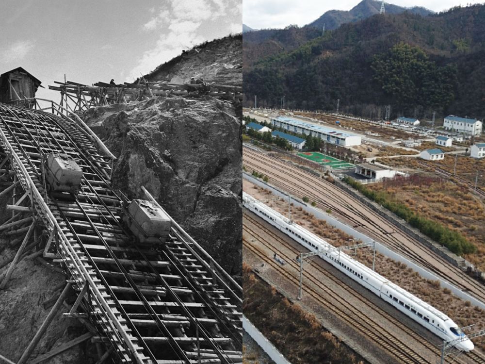 ?。ㄗ髨D:1957年金寨響洪甸水庫工地上吊車運送混凝土,新華社稿王永嘉攝;右圖:2019年高鐵駛出金寨火車站。新華社記者張端攝)