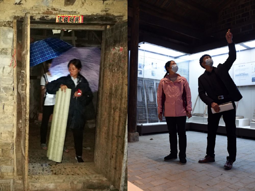 ?。ㄗ髨D:2017年7月的一場大暴雨中,大灣村第一書記余靜轉(zhuǎn)移危房中群眾,新華社記者陳諾攝;右圖:2020年3月19日,大灣村在建農(nóng)俗博物館內(nèi),余靜(左)和施工人員交流。新華社發(fā)周牧攝)