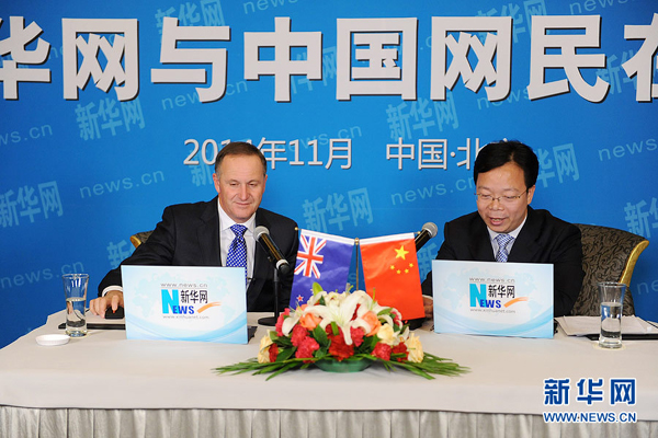 ??? 11月11日,新西蘭總理約翰·基在新華網(wǎng)與中國網(wǎng)民在線交流,回答中國網(wǎng)民的問題。圖為訪談主持人,新華網(wǎng)副總編輯劉加文代表網(wǎng)友向新西蘭總理約翰·基提問。新華網(wǎng) 陳競超 攝