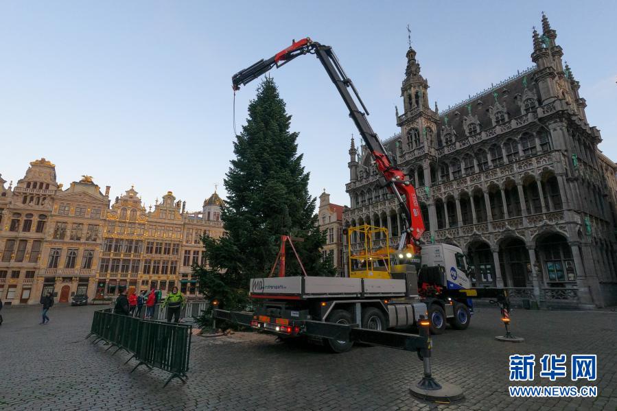 這是11月19日在比利時布魯塞爾大廣場拍攝的圣誕樹安裝現(xiàn)場。